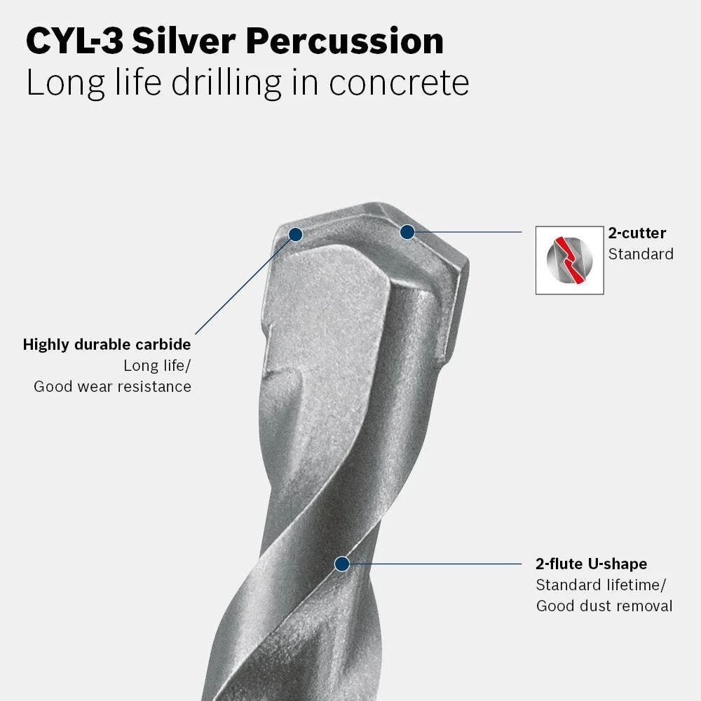 BOSCH® CYL-3 SILVER PERCUSSION Masonry Drill Bits provide lasting performance when drilling concrete. Its stamina is a result of a highly durable carbide blend specially designed and manufactured by BOSCH®. The blend is adapted to meet the needs of repeated use and offers high wear resistance when working with concrete.
