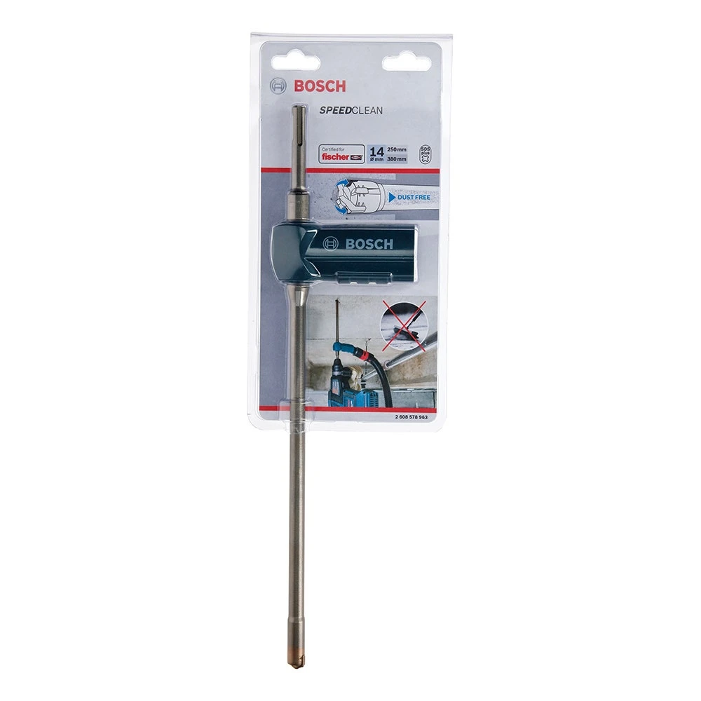 BOSCH® SPEEDCLEAN™ Dust Extraction Hammer Drill Bits provide users with a concrete drilling solution which considerably reduces dust when used with a suitable Dust Extractor. During application, the built-in vacuum attachment pulls dust though extraction holes in the drill bit, allowing optimum material removal without additional steps. This technology results in a clean, dust-free working environment. The bit is intended for use on concrete and other masonry surfaces.