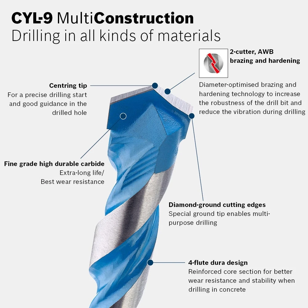 BOSCH® CYL-9 MULTICONSTRUCTION™ TCT Multi-Purpose Drill Bits are the perfect drilling solution for users needing to drill through a wide variety of materials, sometimes in the same application with a single bit.