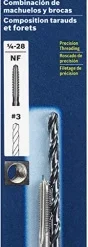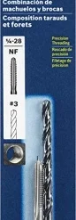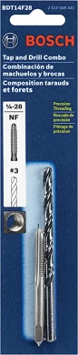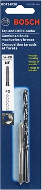 Bosch Tap and Drill Bit Combo Sets are an easy way to ensure drilling the proper hole size before cutting internal threads. Plug taps are ideal for cutting right-hand internal threads; they are the most widely used type of tap, with three to five threads chamfered for general-purpose applications. The included drill bit is matched to the tap for the proper hole size. The bit is designed with split points to reduce bit walking for clean, accurate starts. The bit’s speed helix design promotes fast drilling. The plug tap is recommended when there is sufficient room on a blind hole and tapping to the bottom of a hole is not critical. Made from heat-treated carbon steel, it is a rust- and tarnish-resistant tool. The rolled threads are more accurate and cleaner than machined threads. They are tooled to the most exacting specifications to ensure that bolts anchor securely. Laser-etched marking ensures size identification and won’t wear off. They feature a precise flute design to ensure fast and easy chip clearance.
