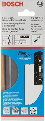 Made for use with Bosch 1640VS FineCut Power Handsaw. High-alloy steel (HAS) blades are constructed with hardened ground teeth. A fine-tooth design provides smooth, tear-free cuts; flex-resistant steel blade guides provide accurate guidance. Designed for cut-offs, mitres and other fine cutting of wood, wood composites and plastics.